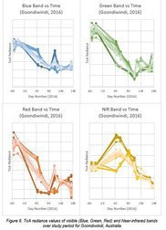 Figure 7 went on to evaluate the most viable visible band for distinguish cotton readiness, through comparing the relative changes in radiance values across the scenes, for each study region. An average radiance value for each scene per band was obtained, and plotted. The selected points in Goondiwindi were divided into two graphs to differentiate between plantations that had a visible spectral radiance increase in Day 114 (23rd April), and Day 124 (3rd May). The results showed that out of the three colored visible bands, the red band (600-670nm) had the largest percentage increase across all three areas during the suggested readiness period.